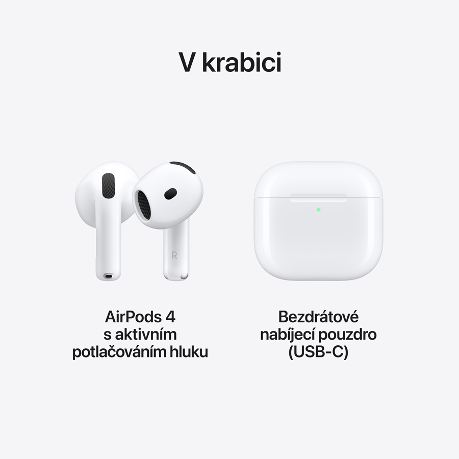 AirPods 4. Ještě lepší zvuk a pohodlí. Dvě varianty navržené tak, aby ti líp padly do uší. Poslech si užiješ jako nikdy předtím. A poprvé v tomhle provedení i s aktivním potlačováním hluku. (Prostorový zvuk funguje u kompatibilního obsahu v podporovaných aplikacích. K vytvoření osobního profilu je potřeba iPhone s TrueDepth fotosoustavou. Výdrž baterie závisí na nastaveních a způsobu používání zařízení, na prostředí a mnoha dalších faktorech. Testy probíhaly na AirPodech 4 s aktivním potlačováním hluku a vypnutým hlukovým filtrem. Nabíjení vyžaduje kompatibilní USB-C nabíječku. AirPody 4 s aktivním potlačováním hluku podporují bezdrátové nabíjení, které vyžaduje bezdrátovou nabíječku s certifikací Qi. Nabíjecí pouzdro AirPodů 4 s aktivním potlačováním hluku funguje i s nabíječkou Apple Watch.)