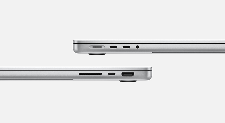 • PŘIPOJÍŠ, CO POTŘEBUJEŠ – 14palcový MacBook Pro má tři porty Thunderbolt 4, nabíjecí port MagSafe 3, slot na kartu SDXC, port HDMI a sluchátkový konektor. A podporuje až dva externí displeje.