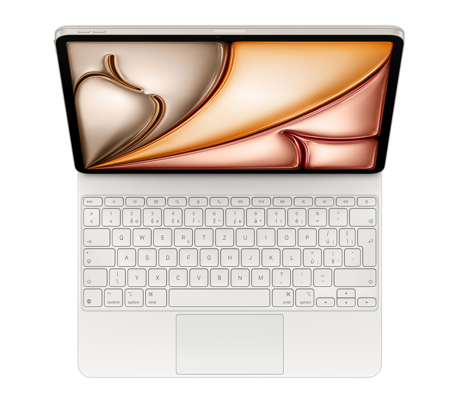 Magic Keyboard je ideální doplněk k iPadu Air. Má elegantní a přenosný design a je na něm radost psát i používat trackpad na přesné ovládání. Nechybí mu řádek 14 funkčních kláves ani USB-C konektor na průchozí nabíjení. Navíc chrání iPad zepředu i zezadu. Plovoucí konzolová konstrukce se dá plynule přizpůsobit do různých pozorovacích úhlů a velký skleněný trackpad rozšiřuje možnosti práce s iPadOS.