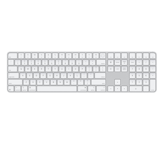 Na Magic Keyboardu s Touch ID a číselnou klávesnicí se píše mimořádně pohodlně a přesně. Klávesnice má rozšířené rozvržení s klávesami na rychlou navigaci v dokumentech a velkými klávesami se šipkami, které přijdou obzvlášť vhod při hraní her. Číselné klávesy usnadňují práci v tabulkových procesorech a ve finančních aplikacích. Klávesnice je bezdrátová a má dobíjecí baterii, která ji na jedno nabití udrží v chodu déle než měsíc.1 S Macem se spáruje automaticky, takže se můžeš rovnou dát do práce.