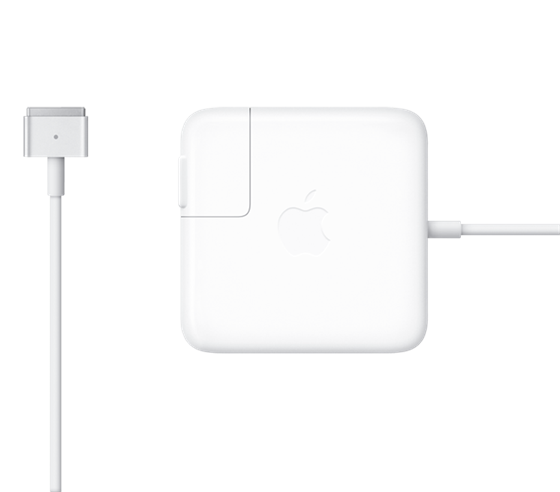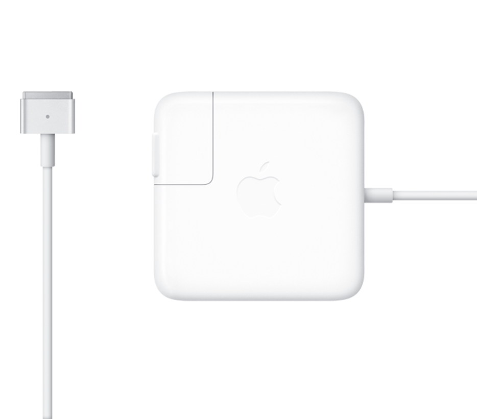 Konektor stejnosměrného proudu u 45W napájecího adaptéru MagSafe 2 je magnetický, takže když o šňůru někdo zakopne, neškodně se odpojí a MacBook Air zůstane bezpečně na místě. Také nedochází k postupnému rozedření a opotřebování kabelů. Kromě toho tento magnetický konektor stejnosměrného proudu usnadňuje rychlé a bezpečné připojení zástrčky k systému.