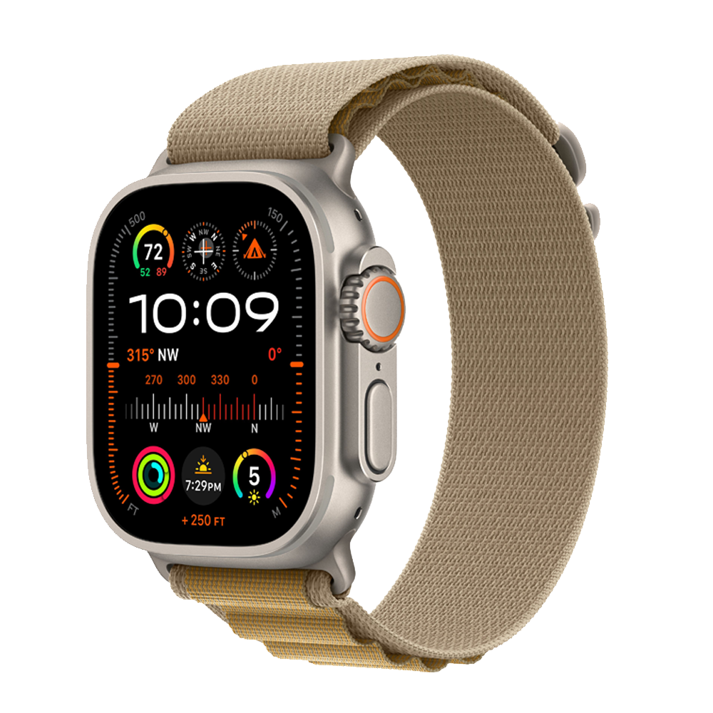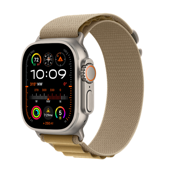 titanové pouzdro s žlutohnědým alpským tahemNejodolnější a nejschopnější hodinky Apple Watch opět posouvají hranice. Nový procesor S9, ovládání dvojitým klepnutím prstů.