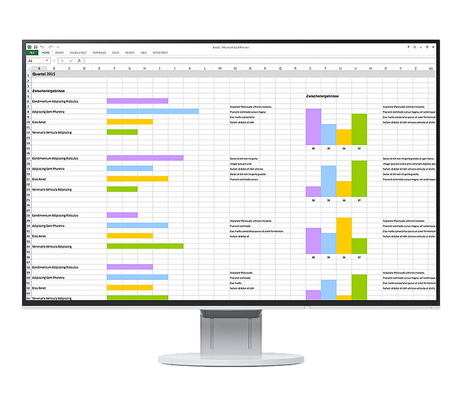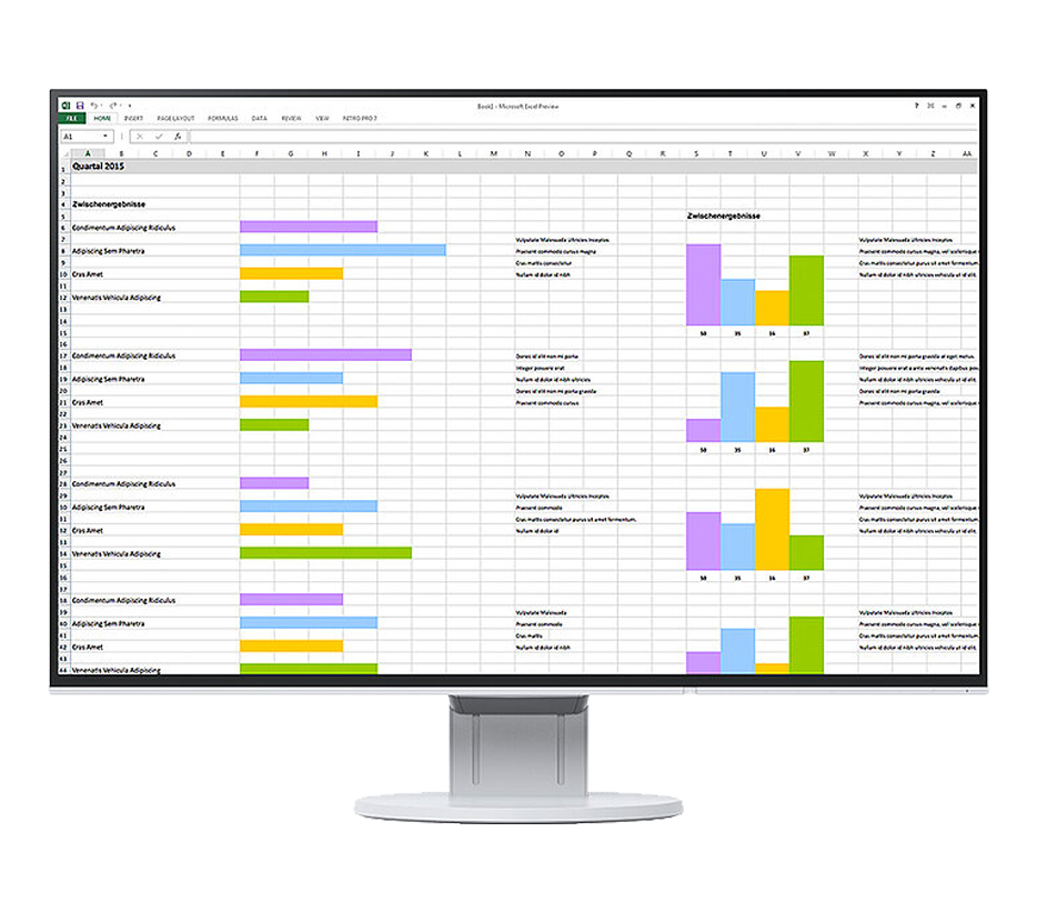 Monitor vytváří harmonický trojakord vynikající kvality obrazu: excelentní rozlišení 1.920 x 1.200 obrazových bodů, nejvyšší kontrast 1.000:1 a stabilní jas až 350 cd/m2. Což znamená: Vidíte text s obrysy ostrými jako břitva, skvostné grafiky a jasné obrázky. Díky kvalitním panelům IPS s podsvícením LED jsou kontrasty a barvy shodné pro libovolný zorný úhel.