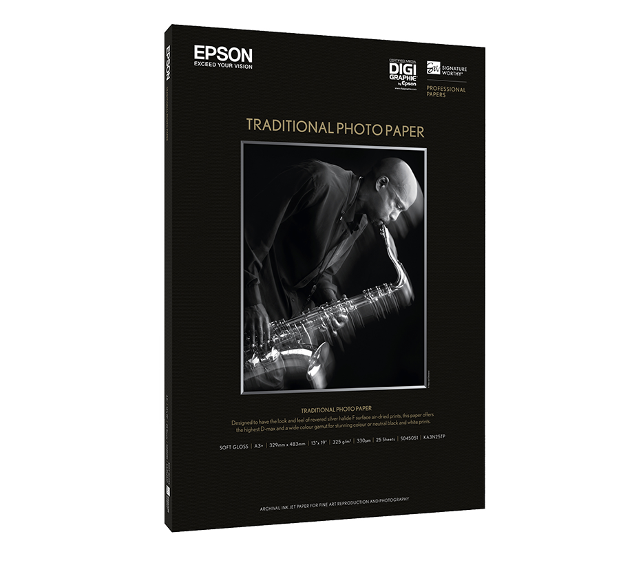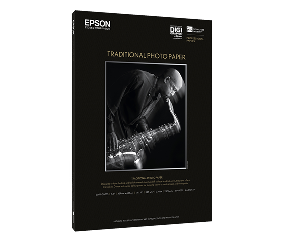 Epson Traditional Photo Paper představuje průlom ve výrobě papíru. Byl navržen speciálně pro použití s inkoustem Epson UltraChrome K3, a to ve spolupráci s mnoha čelními profesionálními fotografy tak, aby beze zbytku splnil jejich vysoké nároky. Mnozí, kteří se na vývoji fotopapíru Traditional Photo Paper podíleli, zdůraznili, že jim připomíná klasická halogenidostříbrná média a zároveň nabízí více kreativní kontroly díky mimořádné optické hustotě a reprodukci odstínů v černobílé. Kromě toho mohou na tom samém papíru tisknout ve vynikajících barvách, což na tradičních vláknitých papírech nebylo možné. V kombinaci umělecké formy tradiční fotografie a snadného zpracování a obsluhy digitálního výstupu přináší toto jedinečné médium stejně hluboké černé tóny, jemné přechody a trvanlivé výsledky jako za časů papírů vyvolávaných v temných komorách. Jeho vláknitý základ zdobí plný povrch, rovnoměrná hloubka barev a měkký lesk, díky kterým je ideální jak pro skutečně vybranou reprodukci barev, tak pro tisk v neutrální černobílé při zachování vzhledu a půvabu tradičních vláknitých papírů. Stejně jako ostatní inovativní média Epson je i tento papír navržen a vyroben tak, aby vám nabídl nejvyšší možné rozlišení a sytost barev. Spotřební materiály Epson jsou vždy zárukou prověřené kvality Epson.