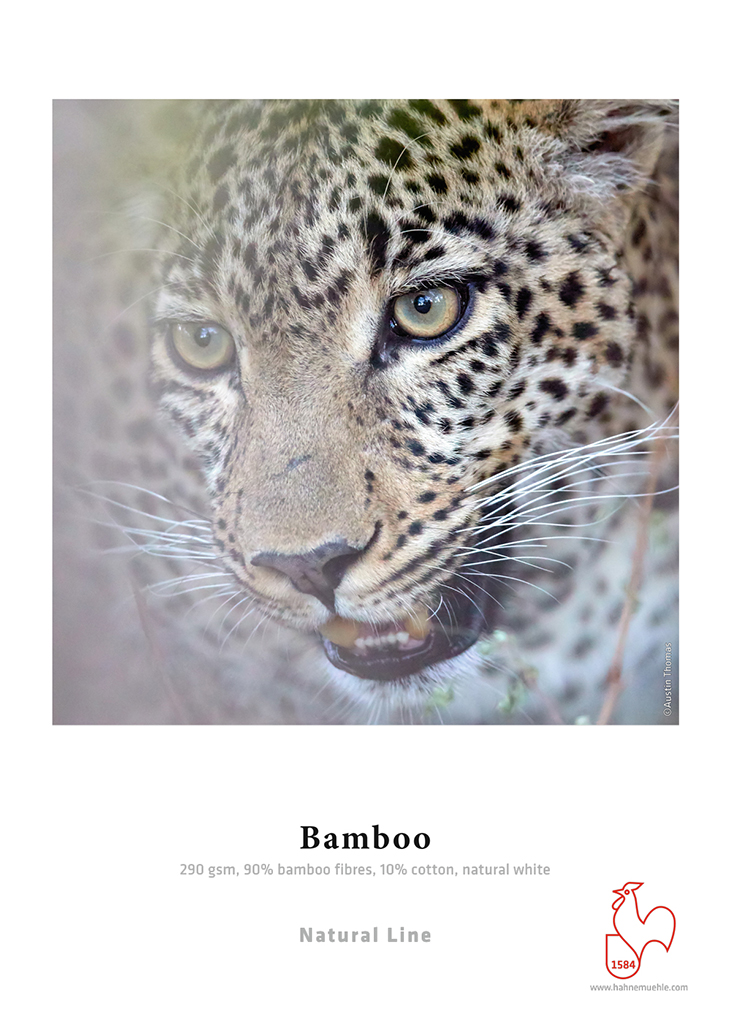 Hahnemühle Bamboo je první inkoustový papír FineArt na světě vyrobený z 90 % bambusových vláken, což zaručuje ekologickou výrobu a přirozený vzhled. Tento přirozeně bílý papír s teplým tónem neobsahuje optické zjasňovače a má jemně strukturovaný povrch, který působí smyslně na dotek. Matný inkoustový povlak zajišťuje vynikající reprodukci barev a detailů, zejména u teplých tónů a monochromatických tisků. Papír je bez kyselin a ligninu, splňuje přísné požadavky na odolnost proti stárnutí. Jedinečná kombinace udržitelných bambusových vláken, měkké povrchové struktury a působivé kvality tisku dodává uměleckému dílu výjimečný výraz.
