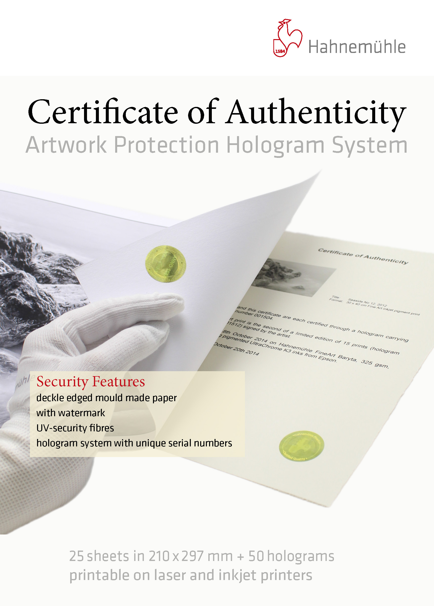 Kombinace certifikátu a hologramu zajišťuje, že každý certifikát pravosti se týká jednoho konkrétního uměleckého díla. Text a rozložení certifikátu lze vytvořit individuálně.