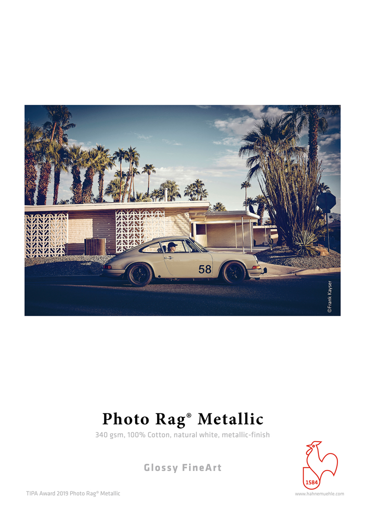 Hahnemühle Photo Rag Metallic je FineArt papír pro inkoustové tiskárny, který vyniká stříbřitým třpytivým povrchem. Tento přírodní bílý bavlněný papír, bez optických zjasňovačů, zachovává charakteristickou strukturu Photo Rag a luxusní vzhled. Speciální kovový efekt a vysoce lesklý inkoustový povlak zaručují vynikající výsledky tisku s intenzivními barvami, hlubokou černou a perfektní reprodukcí barev a detailů. Stříbřitý metalický efekt podtrhuje obraz a rozzáří motivy s kovovými prvky, odlesky, led a sklo, snímky architektury a krajiny i černobílé fotografie s vysoce kontrastními tóny. Photo Rag Metallic je bez kyselin a ligninu a splňuje nejnáročnější požadavky na odolnost proti stárnutí.