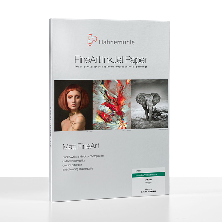 Hahnemühle Photo Rag Ultra Smooth se vyznačuje mimořádně hladkým povrchem ideálním pro vysoce kvalitní Fine Art inkoustový tisk. Tento bílý bavlněný umělecký papír má velmi jemný texturovaný povrch, měkký na dotek. Jeho prvotřídní matná inkoustová povrchová úprava zajišťuje vynikající tiskové výsledky s hlubokými černými tóny a širokou produkci barev. Photo Rag Ultra smooth je všestranný papír vhodný pro uměleckou fotografii a reprodukce. Díky absenci ligninu a kyselin je vysoce odolný vůči stárnutí.