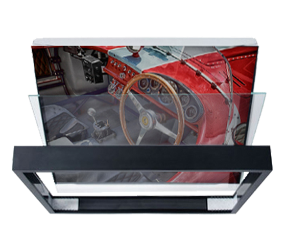 Výchozím bodem je kovová základna s prodlouženou hranou pro rychlé a přesné umístění obrazu s rámem a skleněnou tabulkou.