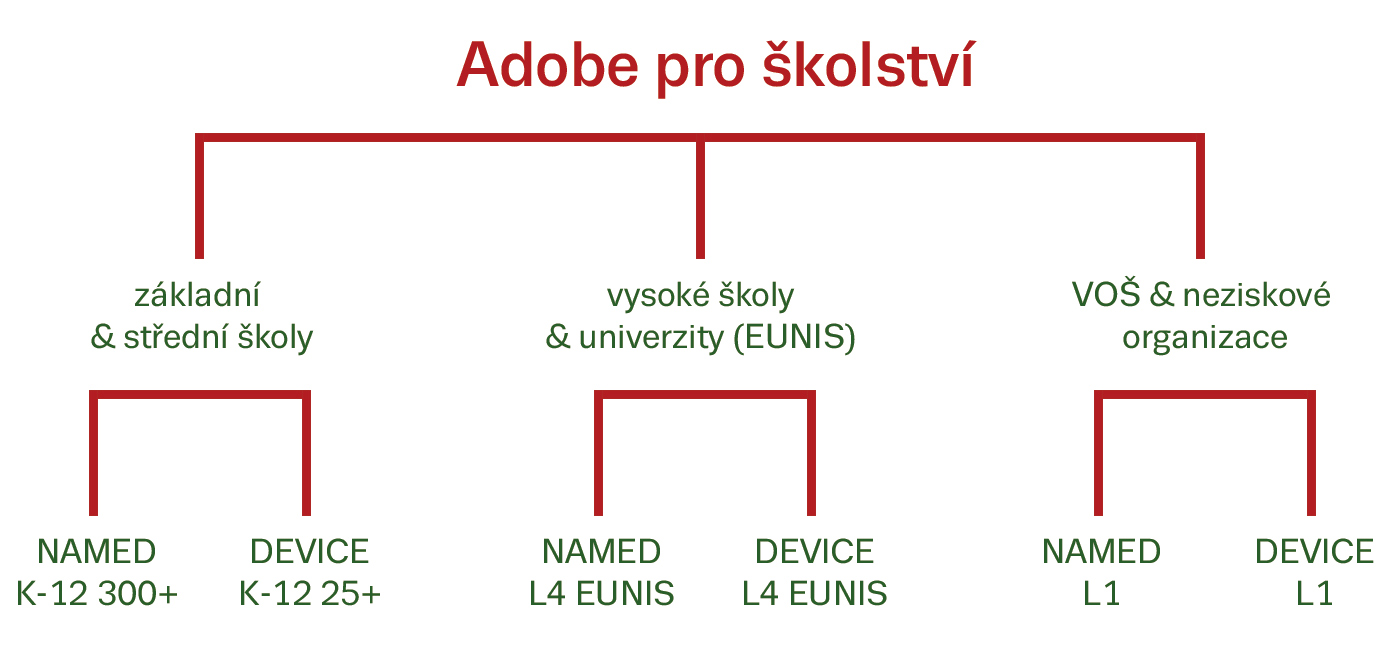 Licence pro vysoké školy zapojené do programu EUNIS. Licence se přidělují konkrétním osobám (emaily - Adobe ID) a jednu licenci je možné nainstalovat na dva počítače.