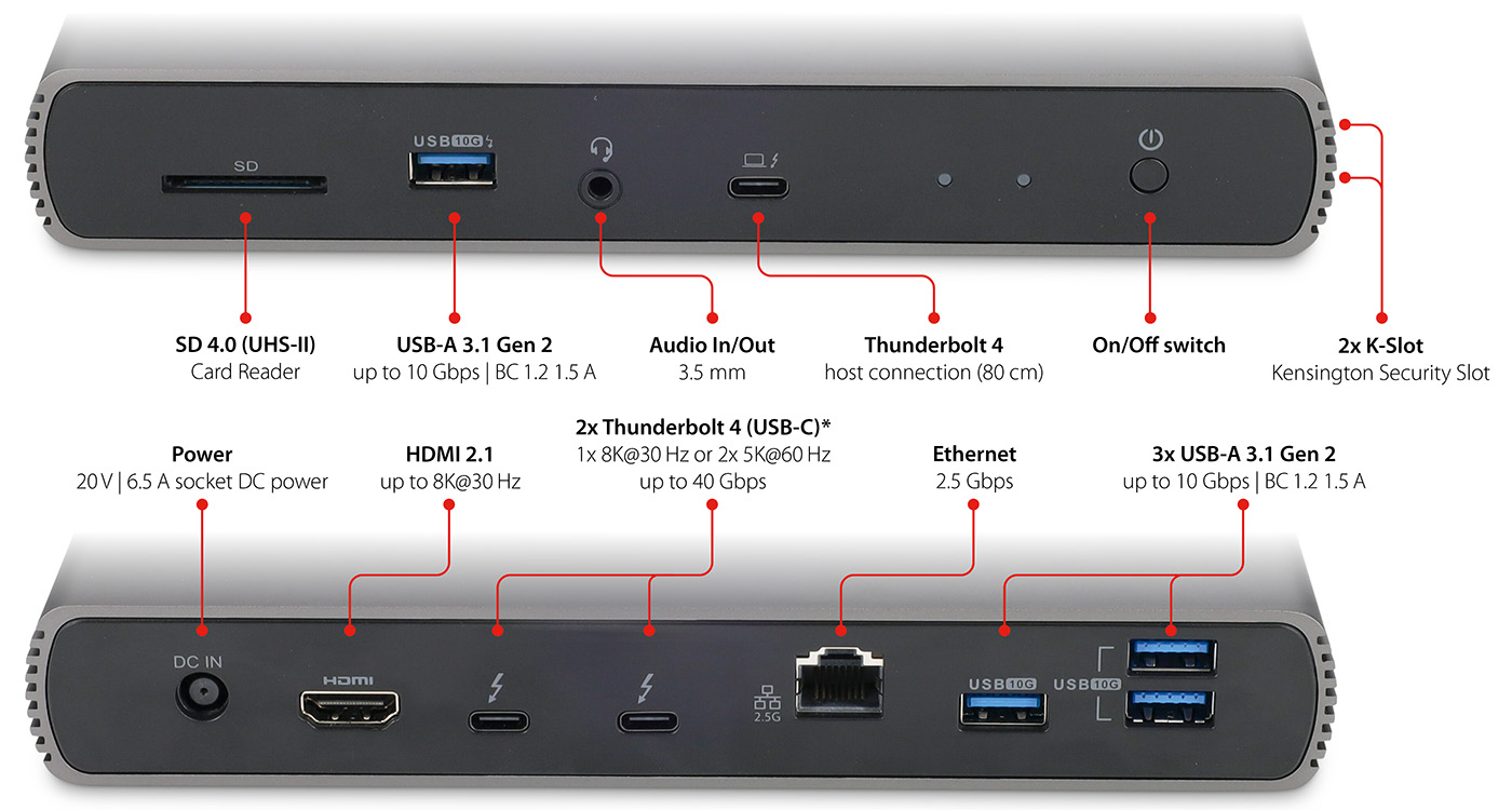 Dva porty Thunderbolt 4 slouží k připojení jednoho monitoru s rozlišením až 8K@30 Hz nebo dvou monitorů s rozlišením až 5K@60 Hz, systémů Raid, externích disků SSD a mnoha dalších zařízení Thunderbolt/USB-C. Kromě toho mají uživatelé k dispozici 4 porty USB-A, 2,5 gigabitový ethernetový port, čtečku karet SD, 3,5mm jack (reproduktor/sluchátka a mikrofon) a port HDMI 2.1 (až 8K@30 Hz). Kromě toho se ThunderDock ideálně hodí pro připojení dvou displejů Apple Studio (každý s rozlišením 5K@60 Hz) prostřednictvím dvou portů Thunderbolt 4.