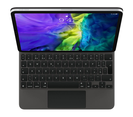 Magic Keyboard je skvělý doplněk iPadu Pro. Píše se na na něm nejlíp ze všech klávesnic k iPadu. Má trackpad s novými možnostmi ovládání iPadOS a USB-C port na nabíjení iPadu Pro. Chrání ho zepředu i zezadu. iPad Pro se k plovoucí konzolové konstrukci Magic Keyboardu přichycuje magneticky, takže si ho hladce nastavíš přesně do takového úhlu, ve kterém se ti na něj dívá nejlíp.