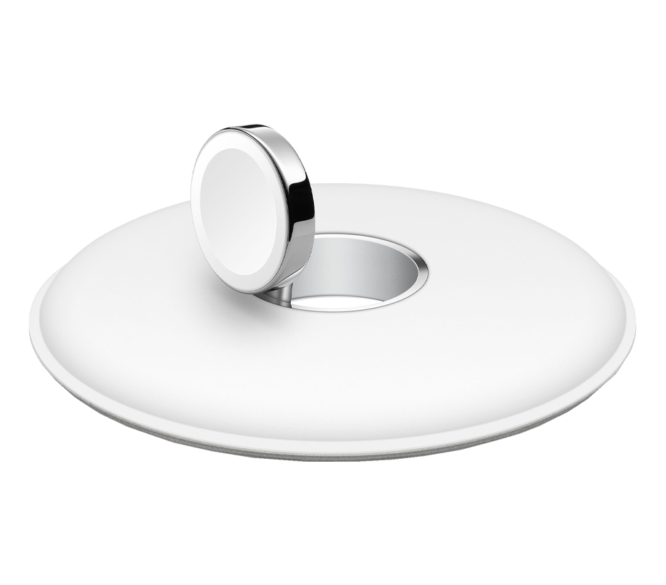 bílýMagnetickým nabíjecím dokem pro Apple Watch můžeš své hodinky nabíjet ve vodorovné poloze s rozepnutým řemínkem nebo v poloze na boku.