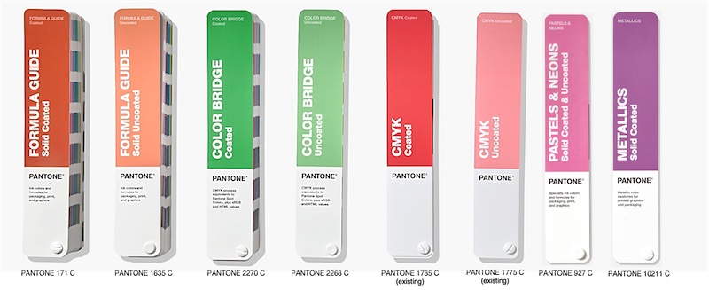 Vzorníky PANTONE Metallics Guide, PANTONE Pastels & Neons a PANTONE CMYK Guide zůstávají obsahově beze změny, jen u nich dochází k záměně přebalové stránky tak, aby barevně odpovídaly celému novému portfoliu.