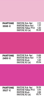 Pantone barvy jsou míchány z určitého počtu základních barev. Procentní složení – receptura – je pak uvedena u každého políčka ve vzorníku Formula Guide.
