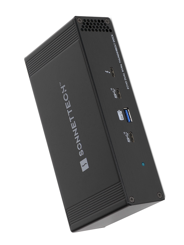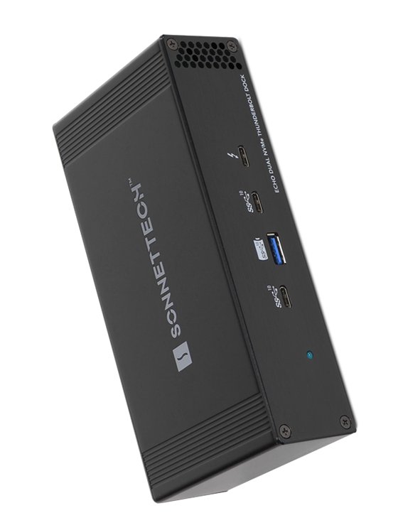 Echo Dual NVMe Thunderbolt Dock je vybaven dvěma sloty M.2 NVMe PCIe SSD, které umožňují snadnou instalaci vysoce výkonných SSD M.2 NVMe (prodávají se samostatně). Vzhledem k tomu, že instalované SSD jsou propojeny s řadičem Thunderbolt doku, využívají jeho šířku pásma k poskytování výkonu přenosného Thunderbolt SSD, ale jsou úhledně schované v doku. Seznam podporovaných SSD najdete zde.