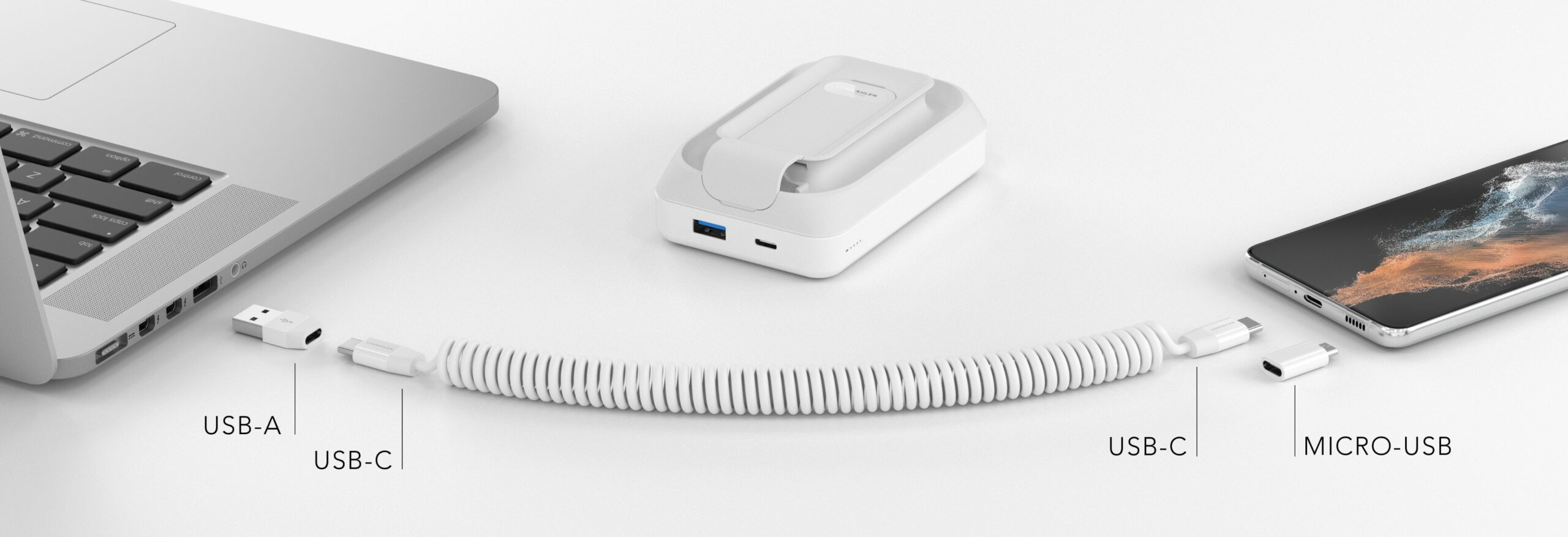 Díky integrovanému kabelu USB-C na USB-C a adaptérům Micro-USB a USB-A umožňuje allroundo® Pro bezproblémové připojení ke všem koncovým zařízením. Kromě toho nabízí také nabíjecí zásuvku pro hodinky Apple Watch a podporuje bezdrátové nabíjení smartphonů s podporou QI. Součástí balení je magnetická nálepka pro všechna zařízení, která nejsou od společnosti Apple.
